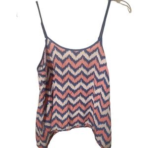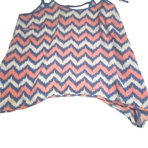 The first photo is the back. This is a silky drifit like tank top. Chevron style. Medium or small no flaws