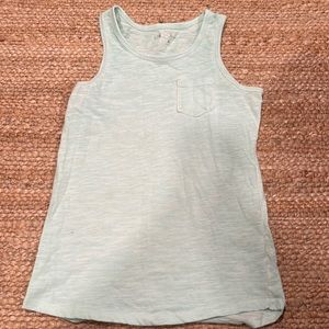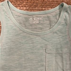 Teal tank top that has a very lightweight feel to it. Good to work out in or just simply lounge about. Has a stretchy and soft material. Slightly worn