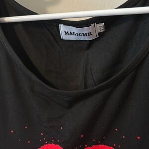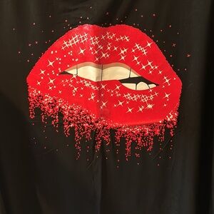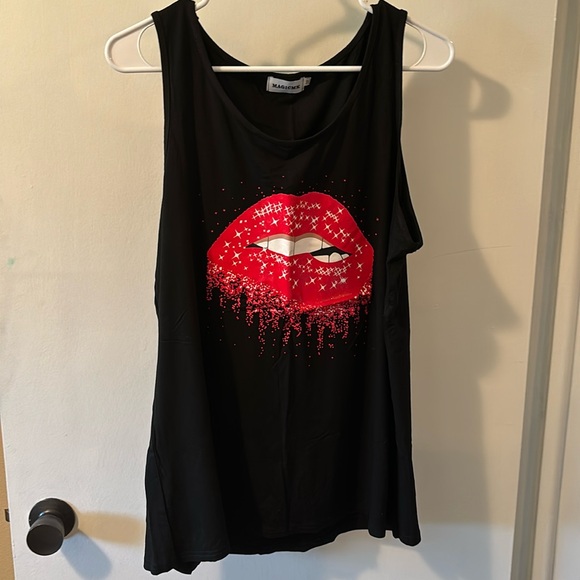 Black tank top with red lip graphic on the front. Straps are about 1 1/2 in. wide. 94% modal 6% spandex