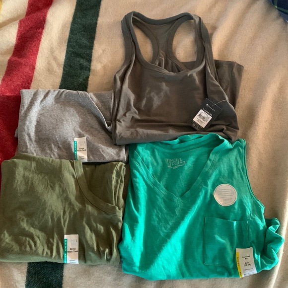 4 brand new tanks. Dark gray and bright green are both a Large. The forest green light gray ones are XL