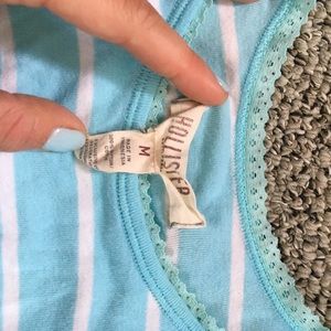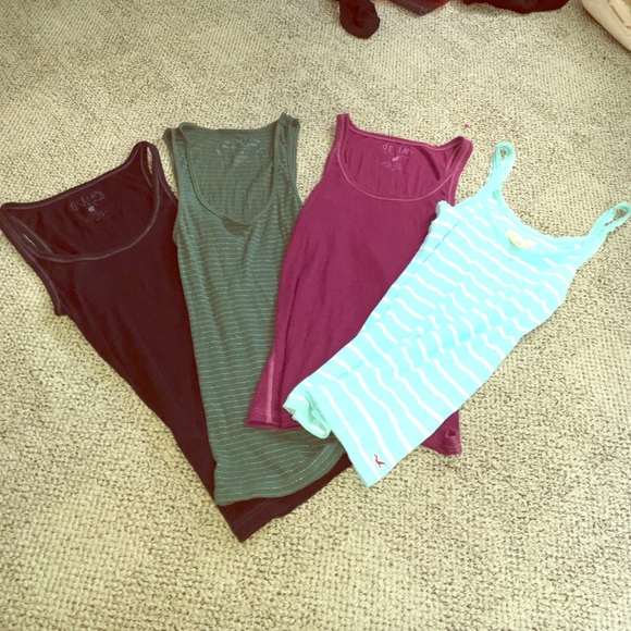 Size medium tank tops! Black tank and plum tank are mediums from Delia's, dark green with silver pin stripes is from American Eagle size medium, and sky blue with white stripes is a medium from Hollister. All with normal wear and tear, still in excellent condition!