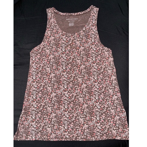 3 different tank tops from American Eagle. 1st one is Maroon with pink flower designs all over top, size extra small, no tears, good condition. 2nd top is olive green, size extra small, no tears, good condition. Last top is gray with an flower stitch designs, size small, has a very small tear which is shown in last picture. It is not noticeable unless top is stretched.