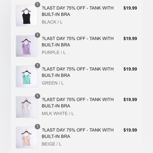 Tank with built in bra that lasted band under the bra shelf, saw fabric adjustable straps, five different colors… Black, purple, green, white, beige. they are larges but are not true to size. I’m not even sure they’re smalls. I would say these are for teenagers or young then 20 year olds.