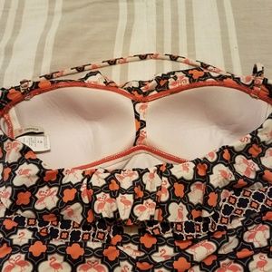 Navy and coral flamigo tankini. Bottoms are large and too medium. Too has removable halter strap and plenty of support for bustier women.