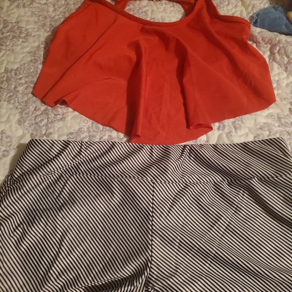 Red top and black and white bottom. Ordered a large and the top looks more like a small . Didn't even try it on .