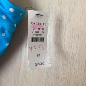 Aqua blue with white small polka dotted tankini top. Lined in front, cross over with a 4” ruffle, gathering at the sides and attached bra with underwire support