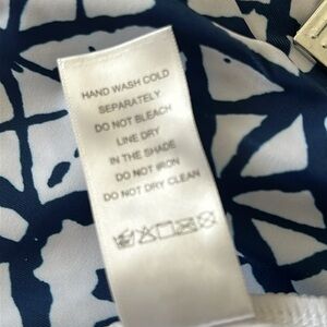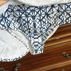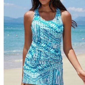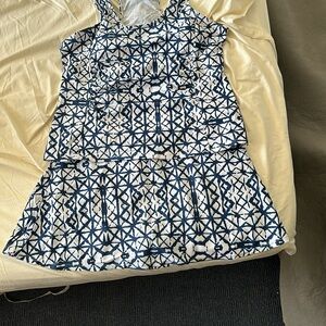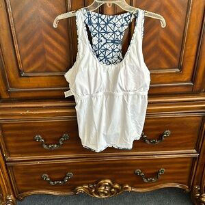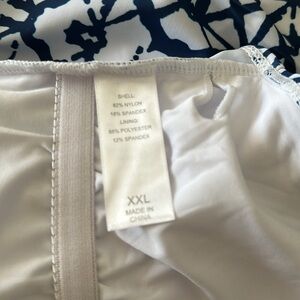 Beautiful blue & white tankini size XXL, skirt is 13.5” long, with panty underneath, waist is 34”with lots of stretch. Extremely comfortable. Top has lots of support, with a racerback design & pads can be removed, front of the top is fully lined, with ruched seams on both sides. This suit has never been worn.