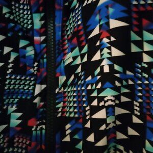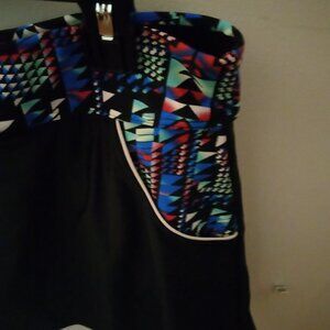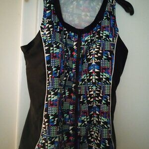 Tanki top has a front zip, bra shelf and soft, molded cups. Skirted bottom has attached brief and side pockets. Fun geometric pattern with black, blue, pink, green and white.
