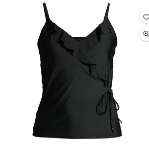 A faux wrap front and ruffle details add a feminine touch to this solid tankini top. Full coverage and smooth fabric offer a flattering fit.