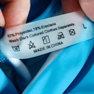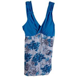 This is a women's pre-owned tankini swim top in size XL. The top features a blue, white, and black floral pattern with wide cinched straps. It is made of polyester, nylon, and spandex and includes built-in padding and a bra for support. The top is stretchy and has strap accents. It is not vintage and is a regular size. The top is perfect for a colorful coastal beach theme and is a one-piece.