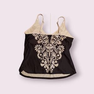 The top has the symmetrical floral pattern on the back, too. Has adjustable straps 6 to 12 inches, a bra top and medium padding. The bottom is lined. Sz 44. Approx measurements laying flat: