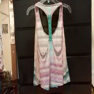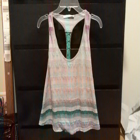 Bright colors. Grey, pink, blue, turquoise, peach colored. Camera makes it look not colorful. Crop top shows belly