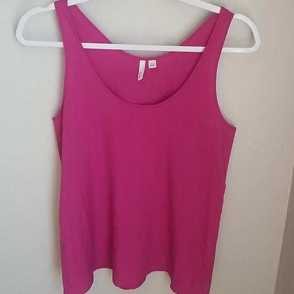 Very lightweight and flowy 97% Polyester 3% Spandex, so not much stretch. The color is a mix between magenta and deep pink. Purchased from Nordstrom