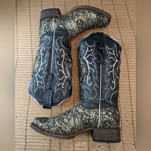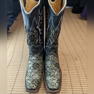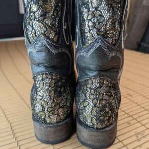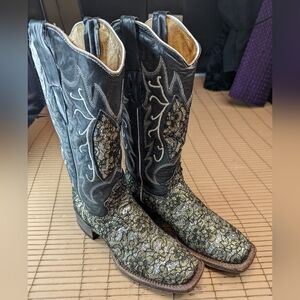 Tanner Mark women's sz 6B Black leather and lace Floral silver and gold Glitter Sparkle, Wide Square toe Western Cowboy Boots. Great condition.
