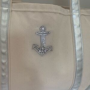 Canvas nautical tote with a rhinestone anchor accent and silver leather bottom.