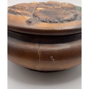 Tannereye Leathered Covered Box Bears on Lid Used item There is discoloration on the lid as well as on the sides