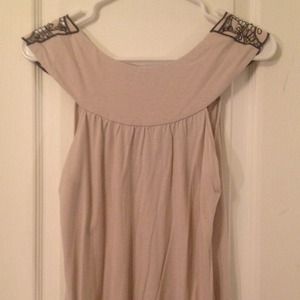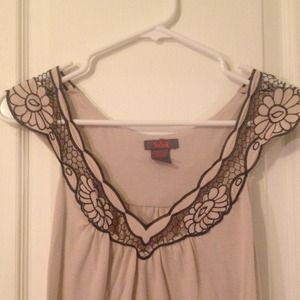 Tannish cream color tank with black flower details around the neck. The bottom is a scrunchie material. Can be dressed up or down. Great condition with no rips or tears.
