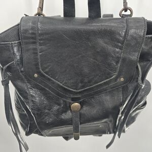Sleek Tano handbag in black leather. Features a zippered pocket and sturdy design. Approximate Measurements Height 12 inches and with strap 24 inches total Length 13 inches Width 5 inches Please look at photos since the backpack has creases typical of leather but no other flaws.