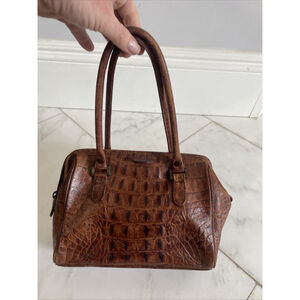 The Tano Brown Crocodile Leather Handbag is a stylish and versatile medium-sized bag perfect for women. Made from high-quality leather with a solid brown exterior and matching brown hardware accents, this top handle bag features a zip closure and a leather lining. The brown crocodile leather adds a touch of sophistication to any outfit, making it a must-have accessory for any fashion-forward woman. With its practical dimensions of 9 inches in width, 7 inches in height, and 7 inches in depth, this handbag is both fashionable and functional for everyday use. It’s real leather but I cannot confirm if it’s real crocodile or embossed to look like it. Great condition, minor wear as pictured