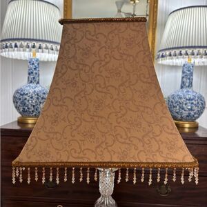Elegant brown lamp shade with intricate patterns and beaded trim. Perfect for adding a touch of sophistication to any room.
