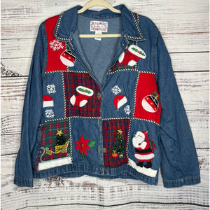 Vintage Tastemaker Denim Christmas Jacket Women’s L Santa Tree Poinsettia Patchwork Jean Coat