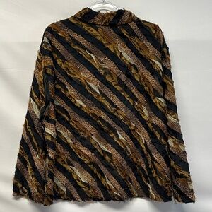 Elevate your wardrobe with this unique and eye-catching jacket from the Tantrums Collection! This lightweight, collared jacket features a captivating distressed animal print in earthy tones of brown and black, giving it a distinctive vintage or Y2K-inspired aesthetic.