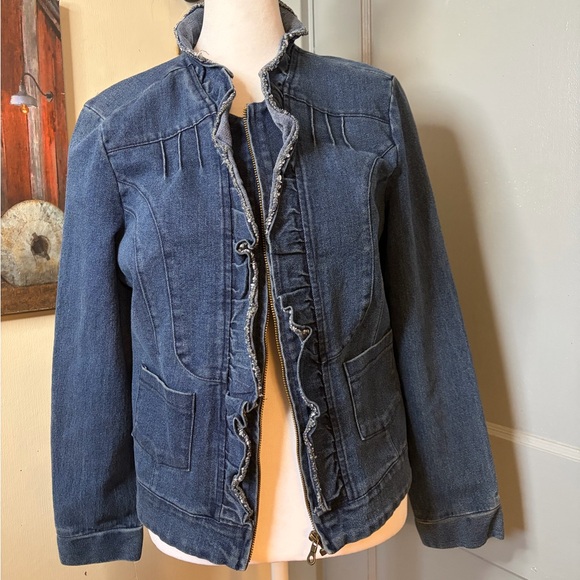 Stylish denim jacket with ruffle trim. Perfect for casual outings.