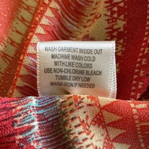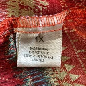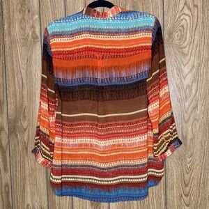 Soft semi sheer 3/4 sleeve pullover blouse by Tantrums. Notched neckline with 2 button closure. 3/4 cuffed sleeves have tabs for roll up option. Pretty tribal style horizontal striped print in oranges, browns and blues. Excellent preowned condition. No snags or flaws noted.