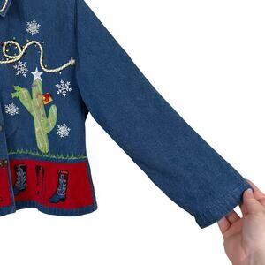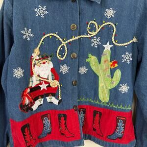 Tantrums Women Mixed Media Denim Shirt Jacket Shacket Size XXL Western Santa Rodeo Boots Cactus Christmas Holiday Ranch Boho Cowgirl.