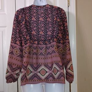Tantrums navy mauve boho aztec sheer style long sleeve blouse Sz S