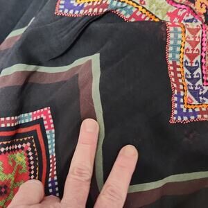 Gorgeous dress by Tanvi Kedia. Black with multi-colored designs. Embroidered stitching throughout. Button keyhole back. Elastic waistband. Lined. There are a few minor snags (see pics), but they really don't show up due to the bold pattern. Overall, it is in very good condition.