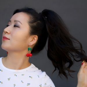 On trend drop cherry earrings. Handmade in Korea. 2" height. 1 1/4" width.