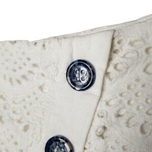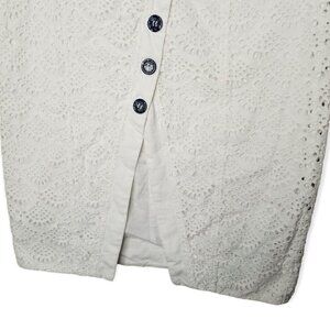 White eyelet midi skirt with asymmetric decorative buttons. Lined. Zips open on the side. Slit in the front making it easier to walk in.