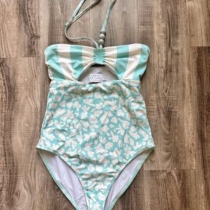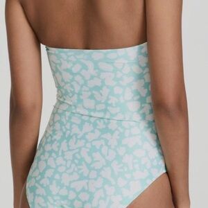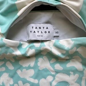 Chic swim top with aqua and white floral pattern. Elegant design by Tanya Taylor.