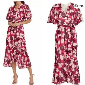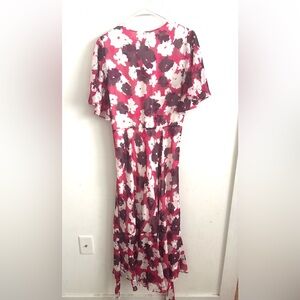 Tanya Taylor Blaire Wrap Midi Dress Sz 8 Red Floral Ruffle V-Neck Flowy Coquette