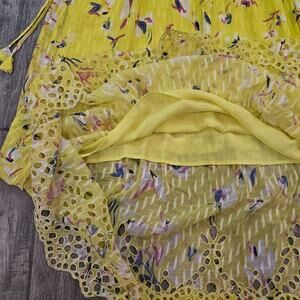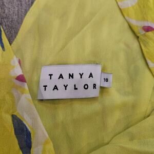 This Tanya Taylor Catalina Silk Maxi Dress in size 16 features a vibrant floral yellow pattern. Crafted from a luxurious silk-cotton blend, it offers a sleeveless design with a flattering V-neckline and a deep V-back. The dress includes an empire waist with side ties and a ruffled lace hem, adding a touch of elegance. Perfect for summer events or resort wear.