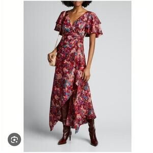 Tanya Taylor Clementine Silk Wrap Maxi Dress 10 Leopard Flutter Sleeve Flamenco