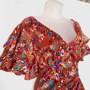 Tanya Taylor Clementine Silk Wrap Maxi Dress 10 Leopard Print Colorful Flutter Sleeve Flamenco
