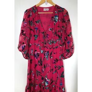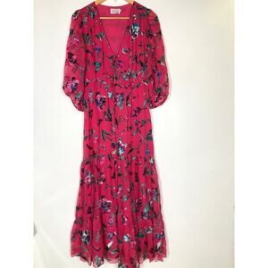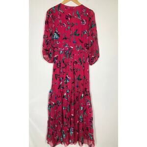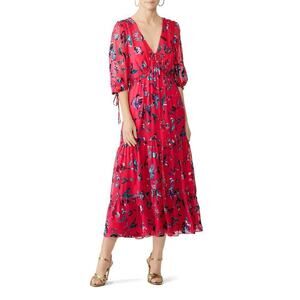 Tanya Taylor Dulce Dress Floral Silk Blend 3/4 Sleeve V-Neck Tiered Midi Hot Pink 6