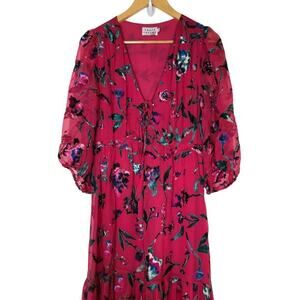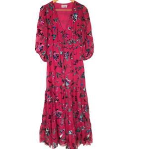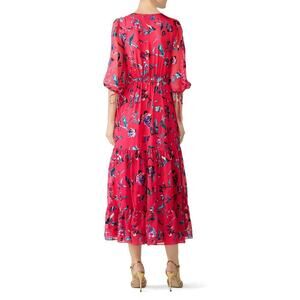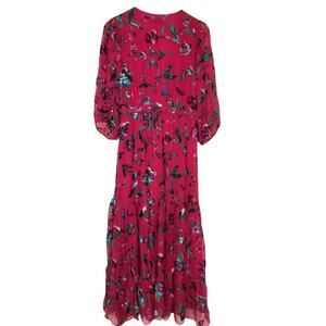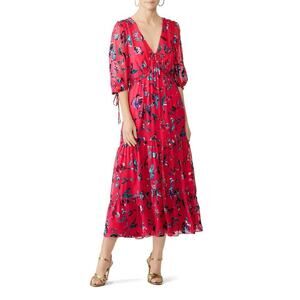Tanya Taylor Dulce Dress Floral Silk Blend 3/4 Sleeve V-Neck Tiered Midi Hot Pink 6