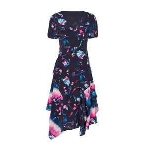 Blue floral (100% Silk). Hourglass. Short sleeves. V-neckline. Side zipper closure. Fully lined.