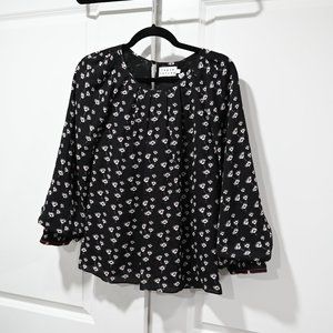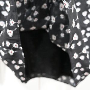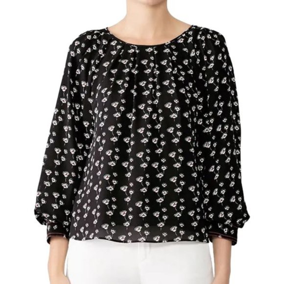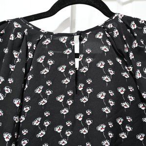 Black floral printed chiffon (100% Silk). Top. Three quarter sleeves. Crew neckline. Back keyhole with button closure. Fully lined.