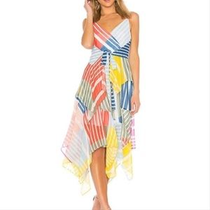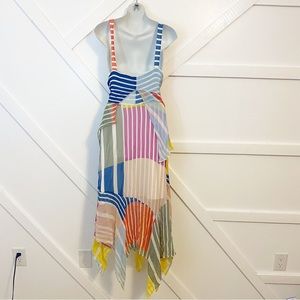 Tanya Taylor Goldie Striped Colorblock Patchwork V-Neck Handkerchief Midi Dress