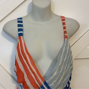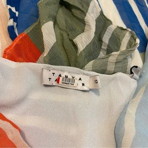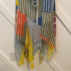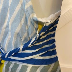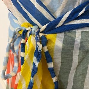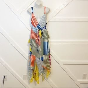 Goldie multicolor stripes colorblock patchwork style midi/maxi dress. Surplice v-neckline. Swingy draped ruffle handkerchief style. Tie at the waist adds extra volume. Side zip closure.
