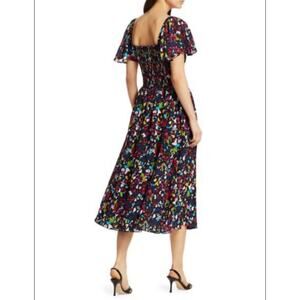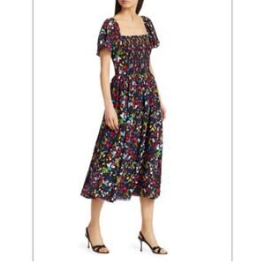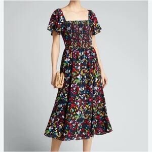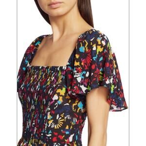 Tanya Taylor Large Glenda Floral Silk Flutter Smocked Square-Neck Midi Dress T5
