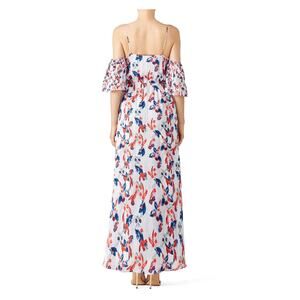White printed silk chiffon maxi dress. 100% silk. Short sleeves with cold shoulder detail. V-neckline. Fully lined. 56” from shoulder to hemline.