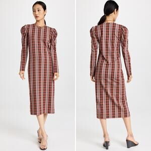 Tanya Taylor Nancy Midi Dress Dark Caramel/Rose Quartz Puff Long Sleeve Med NEW