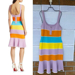 Retail 495 . Knit dress with colorblock pattern and a bodycon silhouette is ruffled at hem.