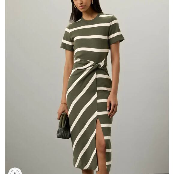 Cut in a flattering sheath silhouette thick cotton knit, short sleeve t-shirt style with a trendy twisted waist side slit for an ultra flattering fit. short sleeves, modest crew neckline making for a great work, career, to weekend dress. Preppy, Prep, professional, old money, quiet luxury vibes.