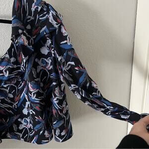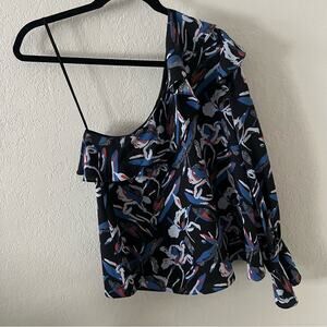 In good preowned condition. Silk. Floral print. Ruffle detail around the neckline. Asymmetric, one shoulder/one sleeve style.